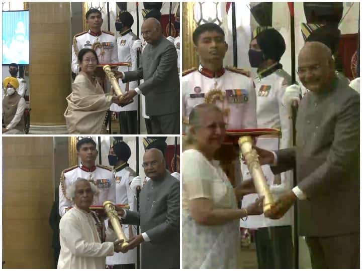 <p style="text-align: justify;"><strong>Padma Awards 2021: </strong>राष्ट्रपति रामनाथ कोविंद (<span class="Y2IQFc" lang="en">President Ram Nath Kovind) </span>आज यानी मंगलवार को राष्ट्रपति भवन में पद्म पुरस्कार विजेताओं को सम्मानित कर रहे हैं. इस समारोह में उन्होंने पूर्व केंद्रीय मंत्री रामविलास पासवान, असम के पूर्व मुख्यमंत्री तरुण गोगोई को मरणोपरांत पद्म भूषण पुरस्कार से सम्मानित किया. वहीं ओडिशा के मूर्तिकार सुदर्शन साहू को कला के क्षेत्र में उनकी असाधारण और विशिष्ट सेवा के लिए पद्म विभूषण 2021 से सम्मनित किया गया. </p> <p style="text-align: justify;">बास्केटबॉल प्लेयर पी अनिता को पद्म श्री से सम्मानित किया गया. अनिता 19 साल की उम्र में टीम की कप्तान बनी थीं. वे टीम की कप्तान बनने वाली सबसे युवा खिलाड़ी रहीं. इसके अलावा आज गुजरात के पूर्व मुख्‍यमंत्री केशूभाई पटेल को मरणोपरांत पद्म भूषण से सम्मानित किया गया. यह पुरस्कार उनके परिवारवालों को सौंपा गया. कर्नाटक के प्रसिद्ध हृदय रोग विशेषज्ञ डा. बेल्ले मोनप्पा हेगडे को पद्म विभूषण और पूर्व लोकसभी स्पीकर और 8 बार सांसद रही इंदौर की सुमित्रा महाजन को से सम्मानित किया गया है. </p> <p style="text-align: justify;">वहीं आज के समारोह की कुछ तस्वीरों को साझा करते हुए बीजेपी के प्रवक्ता संबित पात्रा ने कहा, "कभी-कभी तस्वीरें एक भाषण से ज्यादा बोलती हैं. यहां भारत के परिवर्तन की कहानी है. दिल को छू लेने वाली और अद्भुत."</p> <p style="text-align: justify;"> </p> <blockquote class="koo-media" data-koo-permalink="https://embed.kooapp.com/embedKoo?kooId=75896912-ee05-47a7-a690-72d992204a9a"> <div style="display: flex; flex-direction: column; width: 500px; flex-grow: 2; padding: 5px;"> <div style="display: flex; flex-direction: column; background: #ffffff; box-shadow: 0 0 0 1.5pt #e8e8e3; border-radius: 12px; font-family: ‘Roboto’, arial, sans-serif; color: #424242; overflow: hidden; position: relative;"><a class="embedKoo-koocardheader" style="background-color: #f2f2ef; padding: 6px; display: flex; border-bottom: 1.5pt solid #e8e8e3; justify-content: center; text-decoration: none; color: inherit;" href="https://www.kooapp.com/dnld" target="_blank" rel="noopener" data-link="https://embed.kooapp.com/embedKoo?kooId=75896912-ee05-47a7-a690-72d992204a9a">Koo App</a> <div style="padding: 10px;"><a style="text-decoration: none; color: inherit;" href="https://www.kooapp.com/koo/sambitpatra/75896912-ee05-47a7-a690-72d992204a9a" target="_blank" rel="noopener">Sometimes pictures speak more than a speech ..here’s the story of India’s transformation ..heart touching & amazing 🙏</a> <div style="margin: 15px 0;"><a style="text-decoration: none;" href="https://www.kooapp.com/koo/sambitpatra/75896912-ee05-47a7-a690-72d992204a9a" target="_blank" rel="noopener"> View attached image </a></div> – <a href="https://www.kooapp.com/koo/sambitpatra" target="_blank" rel="noopener">Sambit Patra (@sambitpatra)</a> 9 Nov 2021</div> </div> </div> </blockquote> <p style="text-align: justify;"> <script src="https://embed.kooapp.com/embedLoader.js"></script> </p> <p style="text-align: justify;"><strong><br /></strong>केंद्रीय कानून और न्याय मंत्री किरण रिजिजू ने पद्म विभूषण पुरस्कार प्राप्त करने पर एमसी मैरी कॉम को बधाई दी है. उन्होंने कू ऐप पर पोस्ट करने हुए कहा, "भारत रत्न के बाद दूसरा सर्वोच्च नागरिक पुरस्कार पद्म विभूषण पुरस्कार प्राप्त करने पर एमसी मैरी कॉम को हार्दिक बधाई. छह बार की AIBA महिला बॉक्सिंग चैंपियन मैरी कॉम भारत में महिला बॉक्सिंग का चेहरा हैं."<strong><br /></strong></p> <p style="text-align: justify;"> </p> <blockquote class="koo-media" data-koo-permalink="https://embed.kooapp.com/embedKoo?kooId=52c15e96-379b-4f08-98b5-ccd3cd5c2b43"> <div style="display: flex; flex-direction: column; width: 500px; flex-grow: 2; padding: 5px;"> <div style="display: flex; flex-direction: column; background: #ffffff; box-shadow: 0 0 0 1.5pt #e8e8e3; bo