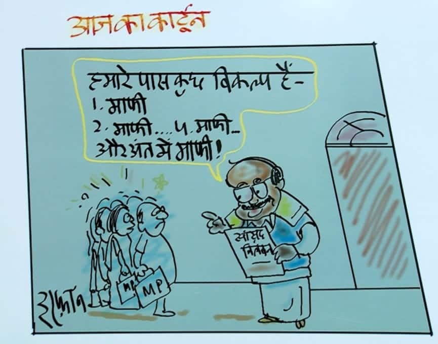<p style="text-align: justify;"><strong>Winter Session of Parliament:</strong> राज्यसभा से 12 सांसदों को निलंबित कर दिया गया है. इस कार्रवाई के बाद लोकसभा और राज्यसभा में मंगलवार को भारी हंगामा देखने को मिला. विपक्षी दलों के नेताओं ने दोनों सदनों में जमकर हंगामा किया. बता दें कि 11 अगस्त को सांसदों को उनके व्यवहार को लेकर यह कार्रवाई की गई है. हालांकि, इसके विरोध में विपक्षी दलों की ओर से संसद परिसर में गांधी प्रतिमा के सामने जमकर विरोध प्रदर्शन किया गया.</p> <p style="text-align: justify;">इसी मुद्दे पर मशहूर कार्टूनिस्ट इरफान ने एक कार्टून बनाया है और इसके जरिए चुटकी ली है. कार्टूनिस्ट इरफान ने एक तरफ सदन से निष्कासित सासंदों को दिखाया है तो दूसरी तरफ राज्यसभा के सभापति एम वेंकैया नायडू को दिखाया गया है. इस कार्टून के जरिए उन्होंने यह भी दिखाया है कि सांसदों के पास सिर्फ माफी का विकल्प है.</p>